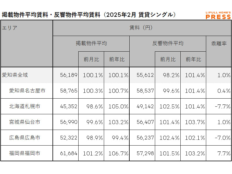 2025年2月の愛知県および地方4市(札幌市、仙台市、広島市、福岡市)のシングル向き賃貸物件の掲載物件平均賃料および反響物件平均賃料は以下の通り。