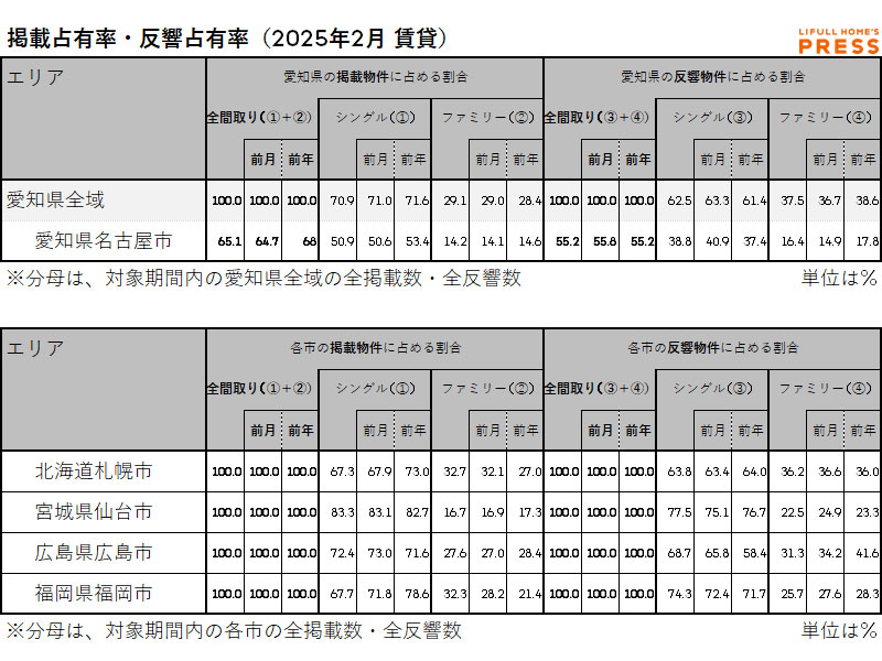 2025年2月の愛知県および地方4市(札幌市、仙台市、広島市、福岡市)賃貸物件市場における、各エリアの掲載占有率および反響占有率は以下の通り。