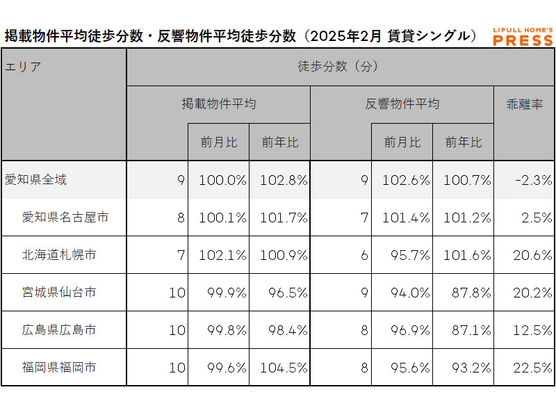2025年2月の愛知県および地方4市(札幌市、仙台市、広島市、福岡市)のシングル向き賃貸物件の掲載物件平均徒歩分数および反響物件平均徒歩分数は以下の通り。
