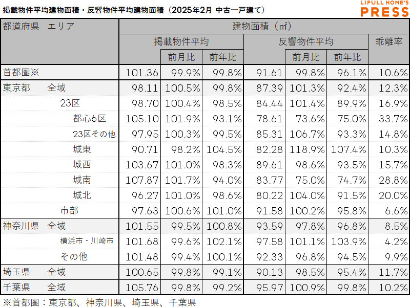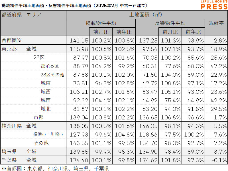 2025年2月の首都圏中古一戸建ての中古一戸建ての掲載物件土地建物面積および反響物件平均土地面積は以下の通り。