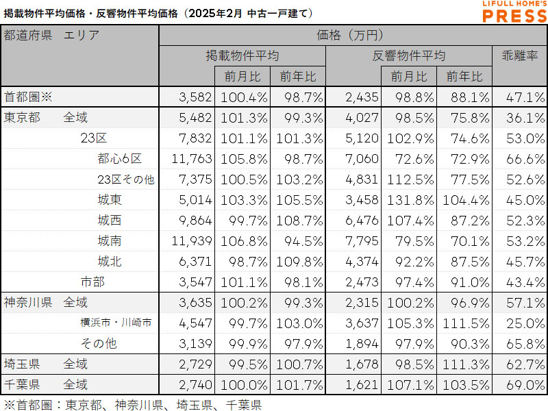 2025年2月の首都圏中古一戸建ての掲載物件平均価格および反響物件平均価格は以下の通り。