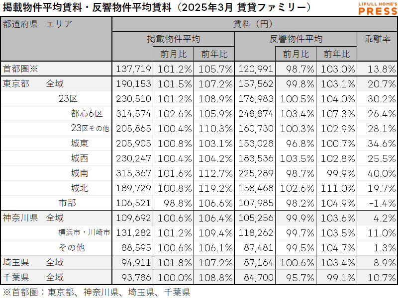 2025年3月の首都圏ファミリー向き賃貸物件の掲載物件平均賃料および反響物件平均賃料は以下の通り。