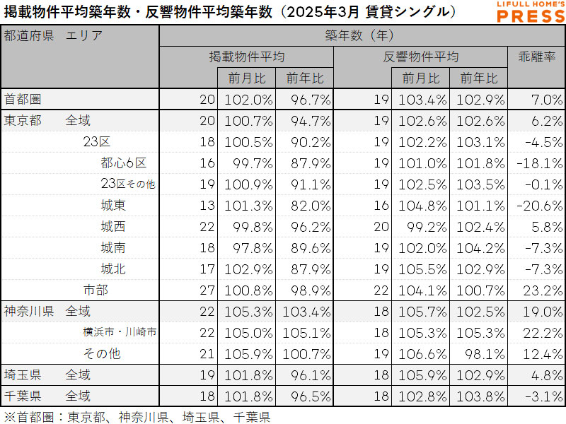 2025年3月の首都圏シングル向き賃貸物件の掲載物件平均賃料および反響物件平均賃料は以下の通り。