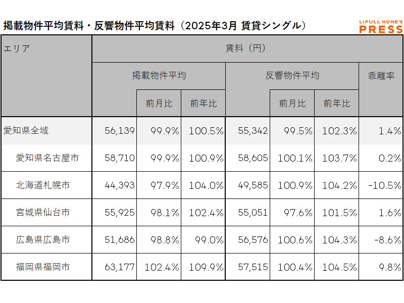 2025年3月の愛知県および地方4市(札幌市、仙台市、広島市、福岡市)のシングル向き賃貸物件の掲載物件平均賃料および反響物件平均賃料は以下の通り。