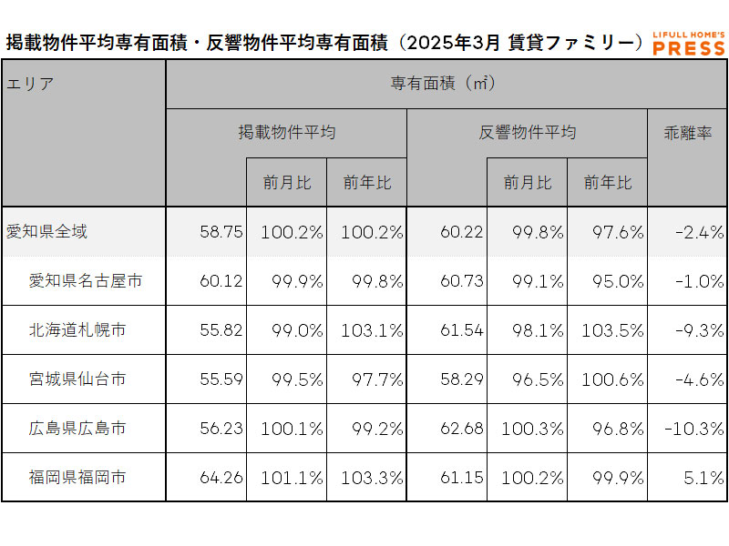 2025年3月の愛知県および地方4市(札幌市、仙台市、広島市、福岡市)のファミリー向き賃貸物件の掲載物件平均専有面積および反響物件平均専有面積は以下の通り。