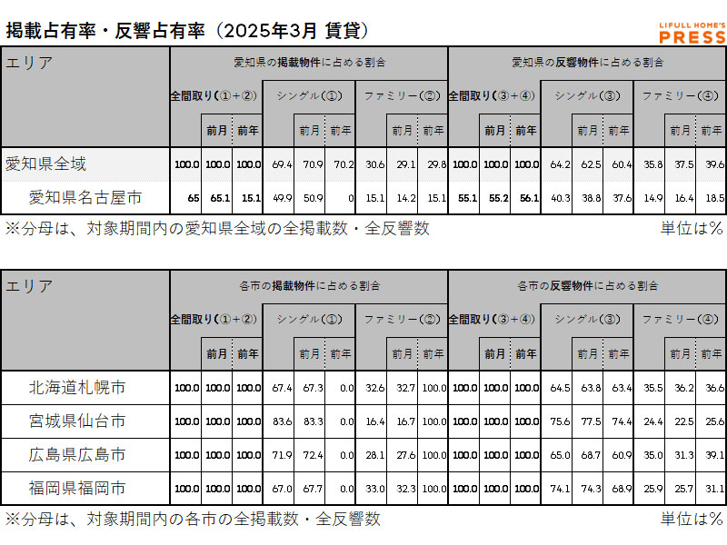 2025年3月の愛知県および地方4市(札幌市、仙台市、広島市、福岡市)賃貸物件市場における、各エリアの掲載占有率および反響占有率は以下の通り。