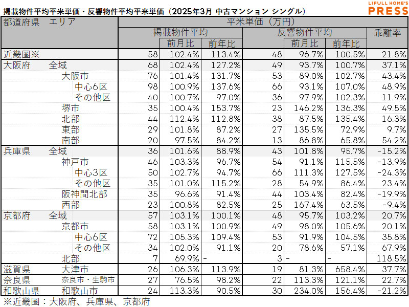 2025年3月の近畿圏シングル向き中古マンションの掲載物件平均価格および反響物件平均価格は以下の通り。