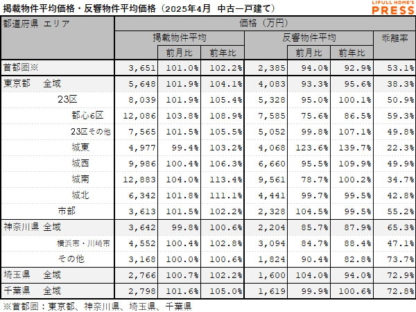 2025年4月の首都圏中古一戸建ての掲載物件平均価格および反響物件平均価格は以下の通り。