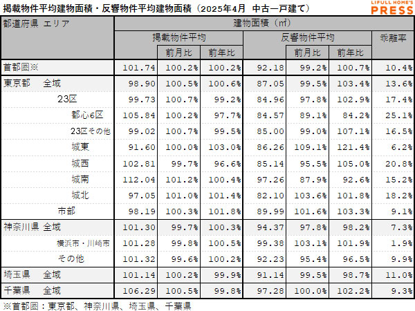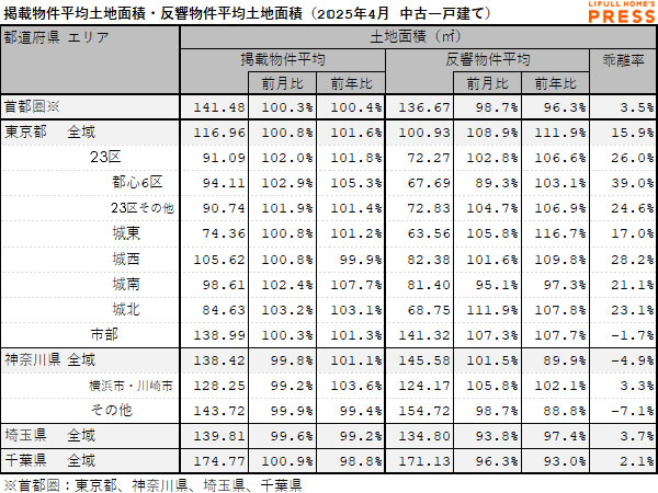 2025年4月の首都圏中古一戸建ての中古一戸建ての掲載物件土地建物面積および反響物件平均土地面積は以下の通り。