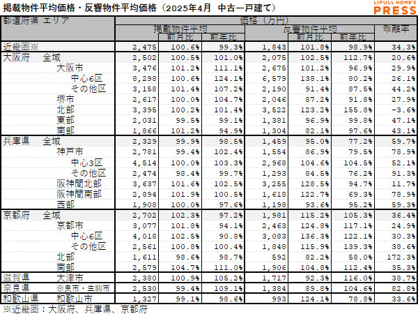 2025年4月の近畿圏中古一戸建ての掲載物件平均価格および反響物件平均価格は以下の通り。