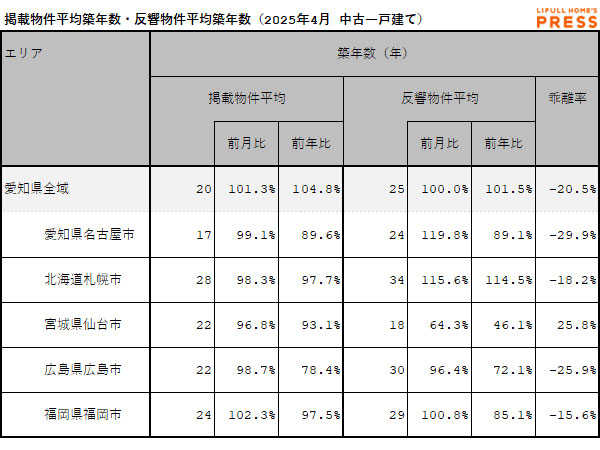 2025年4月の愛知県および地方4市(札幌市、仙台市、広島市、福岡市)の中古一戸建ての掲載物件平均築年数および反響物件平均築年数は以下の通り。