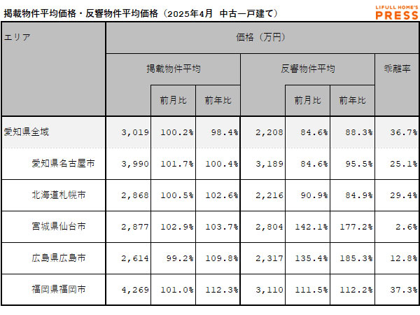 2025年4月の愛知県および地方4市(札幌市、仙台市、広島市、福岡市)の中古一戸建ての掲載物件平均価格および反響物件平均価格は以下の通り。