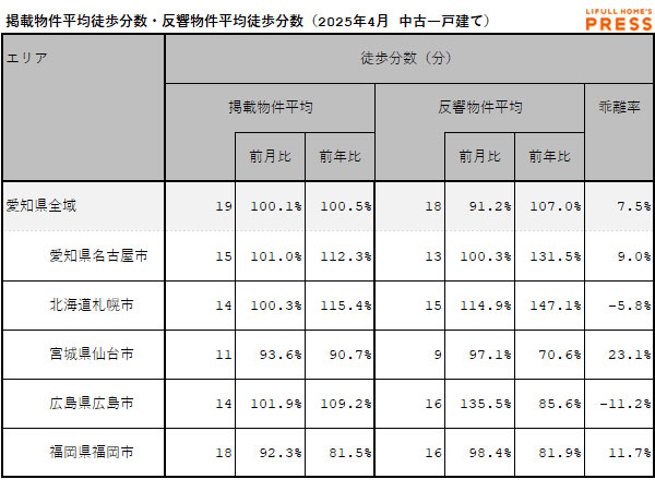 2025年4月の愛知県および地方4市(札幌市、仙台市、広島市、福岡市)の中古一戸建ての掲載物件平均徒歩分数および反響物件平均徒歩分数は以下の通り。