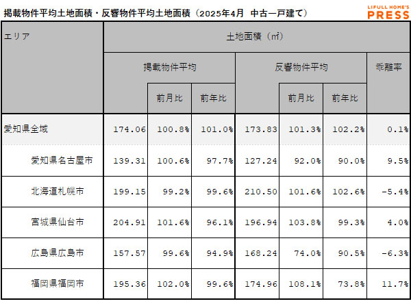 2025年4月の愛知県および地方4市(札幌市、仙台市、広島市、福岡市)の中古一戸建ての掲載物件土地建物面積および反響物件平均土地面積は以下の通り。