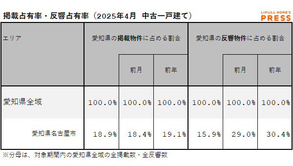2025年4月の愛知県の中古一戸建て市場における、各エリアの掲載占有率および反響占有率は以下の通り。