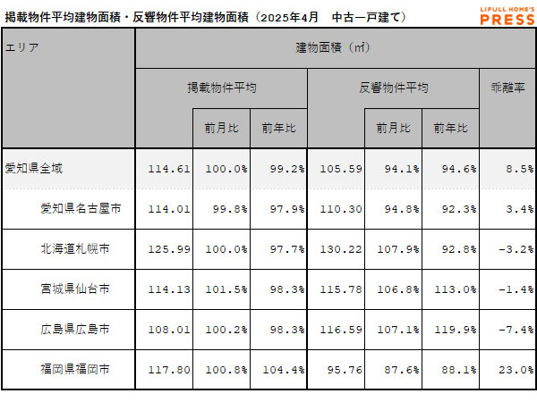 2025年4月の愛知県および地方4市(札幌市、仙台市、広島市、福岡市)の中古一戸建ての掲載物件平均建物面積および反響物件平均建物面積は以下の通り。
