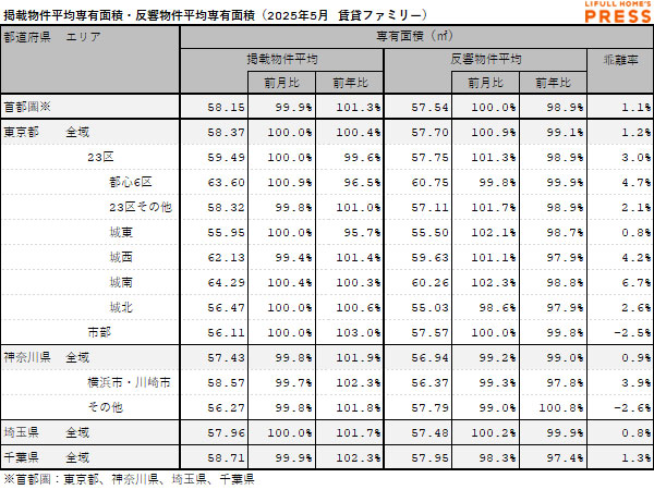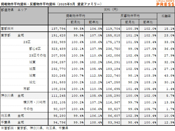 2025年5月の首都圏ファミリー向き賃貸物件の掲載物件平均賃料および反響物件平均賃料は以下の通り。