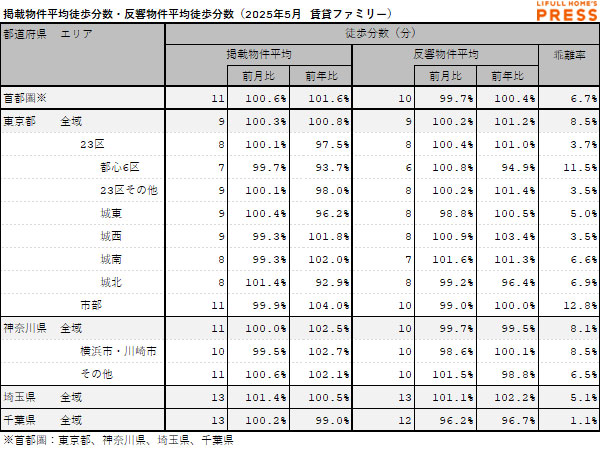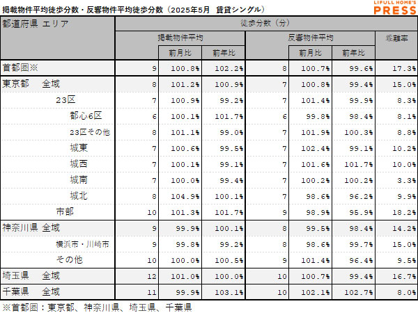2025年5月の首都圏シングル向き賃貸物件の掲載物件平均徒歩分数および反響物件平均徒歩分数は以下の通り。