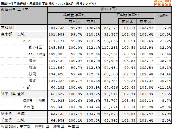 2025年5月の首都圏シングル向き賃貸物件の掲載物件平均賃料および反響物件平均賃料は以下の通り。