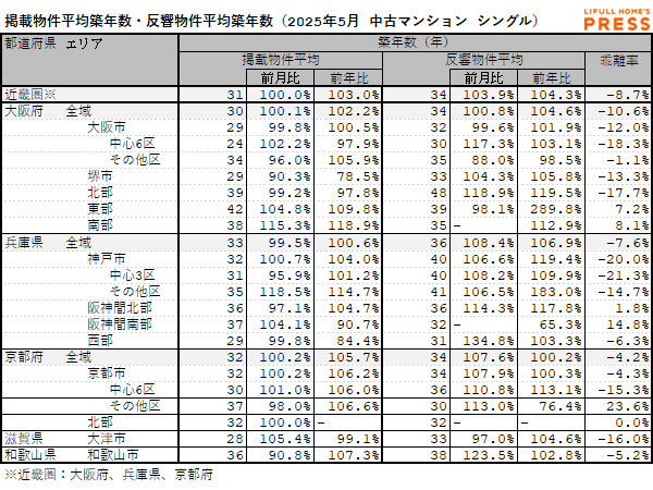2025年5月の近畿圏ファミリー向き中古マンションの掲載物件平均築年数および反響物件平均築年数は以下の通り。