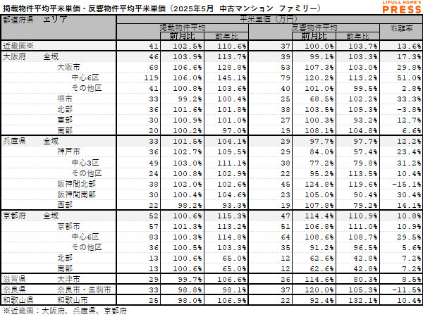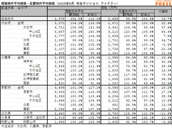 2025年5月の近畿圏ファミリー向き中古マンションの掲載物件平均価格および反響物件平均価格は以下の通り。