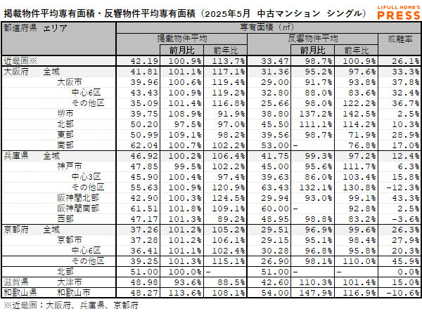 2025年5月の近畿圏シングル向き中古マンションの掲載物件平均専有面積および反響物件平均専有面積は以下の通り。