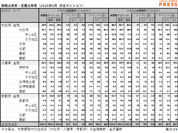 2025年5月の近畿圏中古マンション市場における、各エリアの掲載占有率および反響占有率は以下の通り。