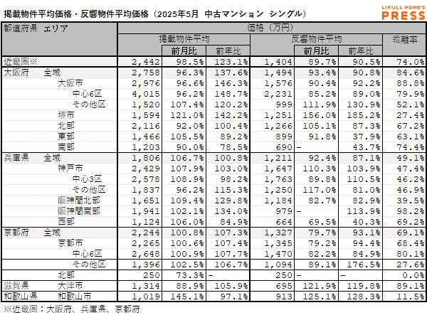 2025年5月の近畿圏シングル向き中古マンションの掲載物件平均価格および反響物件平均価格は以下の通り。