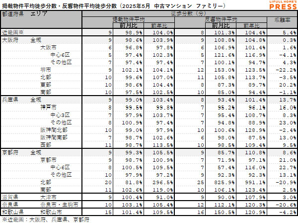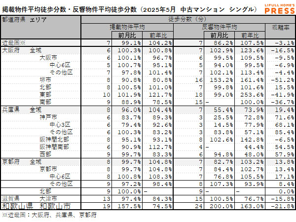 2025年5月の近畿圏シングル向き中古マンションの掲載物件平均徒歩分数および反響物件平均徒歩分数は以下の通り。