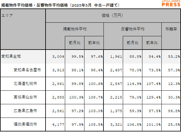 2025年5月の愛知県および地方4市(札幌市、仙台市、広島市、福岡市)の中古一戸建ての掲載物件平均価格および反響物件平均価格は以下の通り。