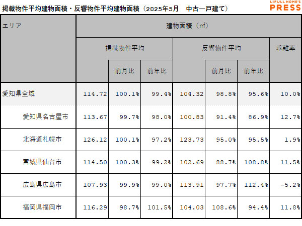 2025年5月の愛知県および地方4市(札幌市、仙台市、広島市、福岡市)の中古一戸建ての掲載物件平均建物面積および反響物件平均建物面積は以下の通り。