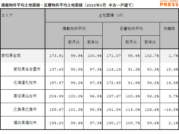 2025年5月の愛知県および地方4市(札幌市、仙台市、広島市、福岡市)の中古一戸建ての掲載物件土地建物面積および反響物件平均土地面積は以下の通り。