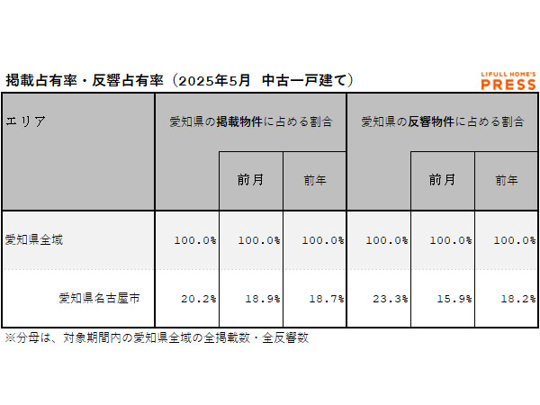 2025年5月の愛知県の中古一戸建て市場における、各エリアの掲載占有率および反響占有率は以下の通り。