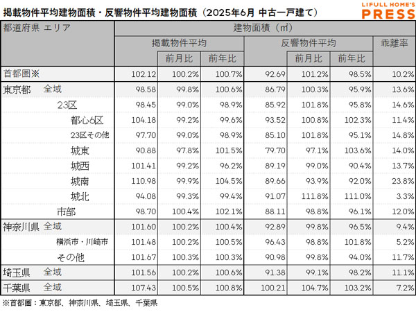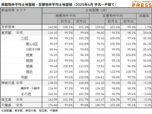 2025年6月の首都圏中古一戸建ての中古一戸建ての掲載物件土地建物面積および反響物件平均土地面積は以下の通り。