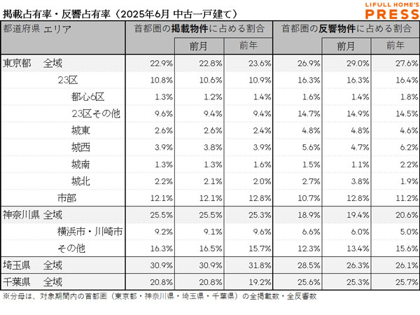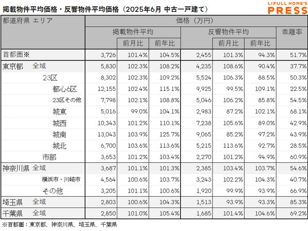 2025年6月の首都圏中古一戸建ての掲載物件平均価格および反響物件平均価格は以下の通り。