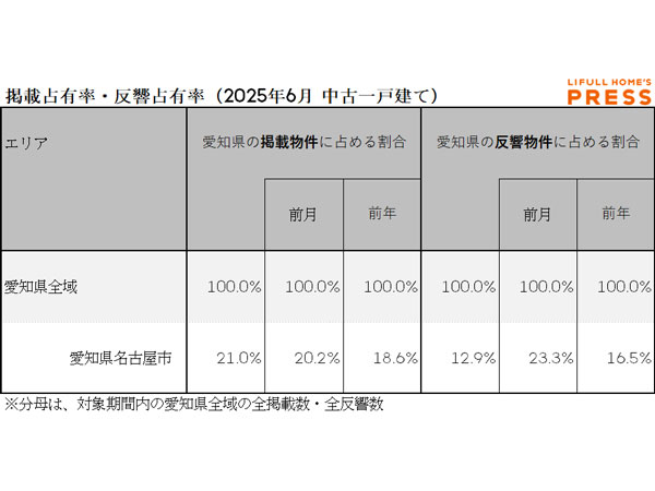 2025年6月の愛知県の中古一戸建て市場における、各エリアの掲載占有率および反響占有率は以下の通り。