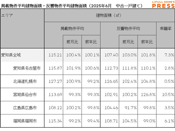 2025年6月の愛知県および地方4市(札幌市、仙台市、広島市、福岡市)の中古一戸建ての掲載物件平均建物面積および反響物件平均建物面積は以下の通り。