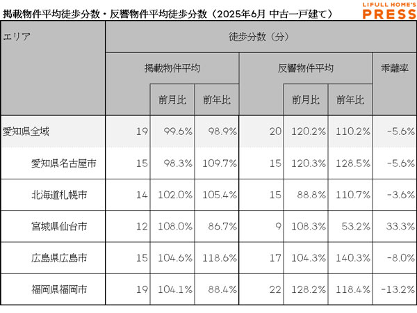 2025年6月の愛知県および地方4市(札幌市、仙台市、広島市、福岡市)の中古一戸建ての掲載物件平均徒歩分数および反響物件平均徒歩分数は以下の通り。