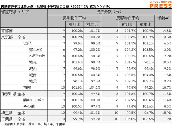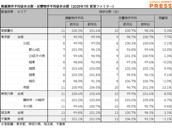 2025年7月の首都圏シングル向き賃貸物件の掲載物件平均徒歩分数および反響物件平均徒歩分数は以下の通り。