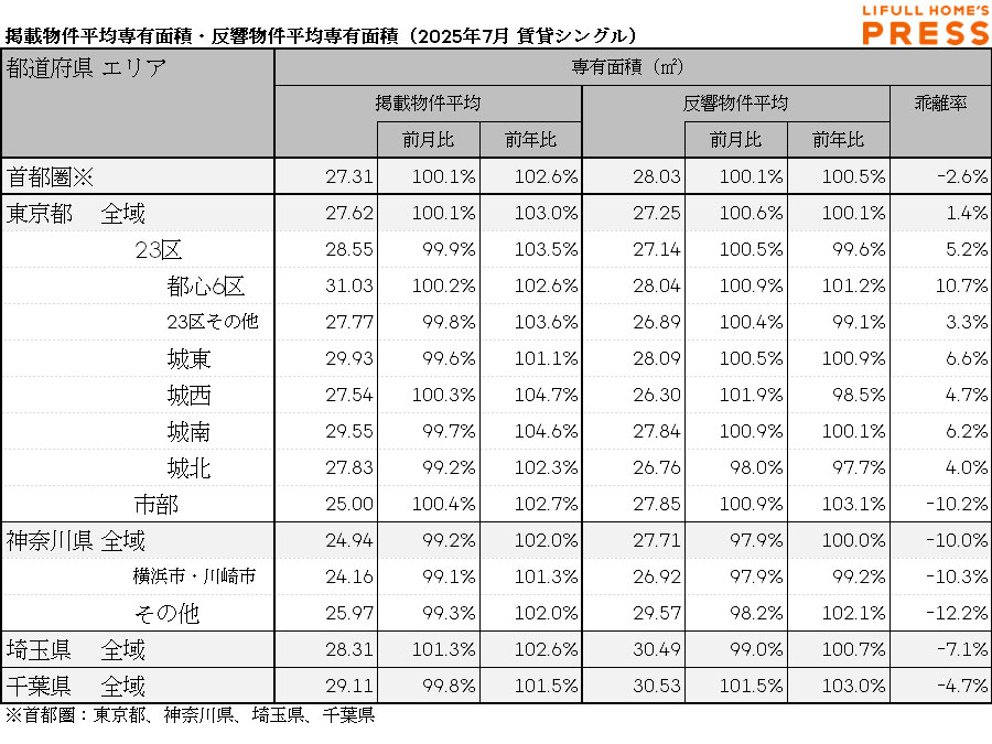 2025年7月の首都圏シングル向き賃貸物件の掲載物件平均賃料および反響物件平均賃料は以下の通り。