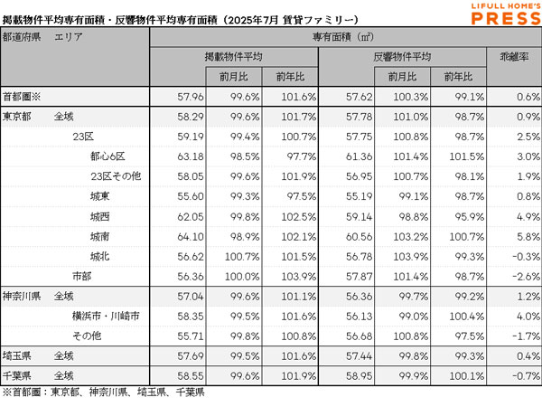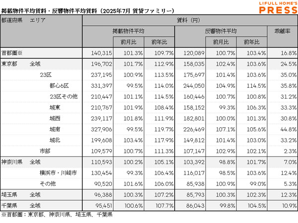 2025年7月の首都圏ファミリー向き賃貸物件の掲載物件平均賃料および反響物件平均賃料は以下の通り。