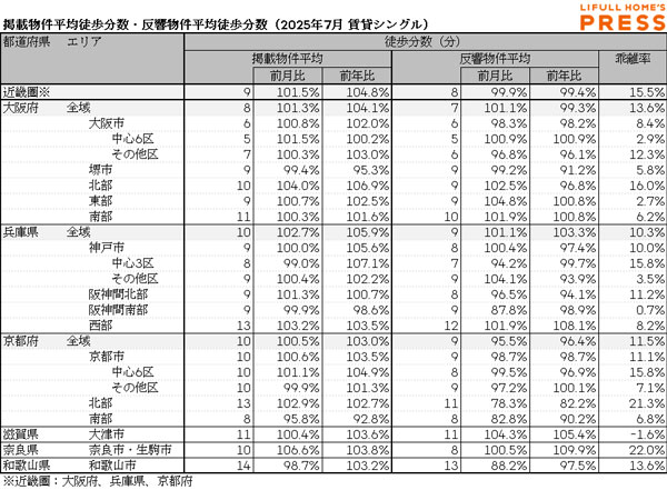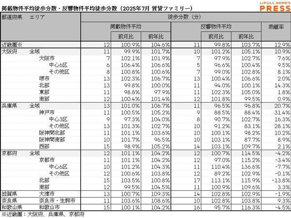 2025年7月の近畿圏ファミリー向き賃貸物件の掲載物件平均徒歩分数および反響物件平均徒歩分数は以下の通り。