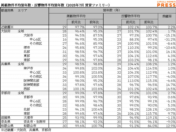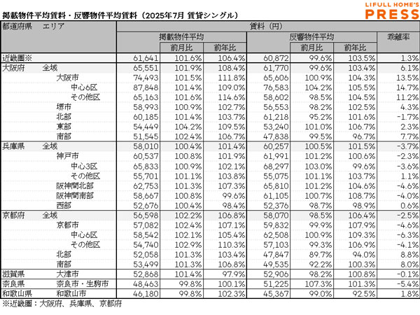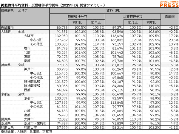 2025年7月の近畿圏ファミリー向き賃貸物件の掲載物件平均賃料および反響物件平均賃料は以下の通り。