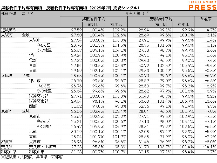 2025年7月の近畿圏ファミリー向き賃貸物件の掲載物件平均専有面積および反響物件平均専有面積は以下の通り。