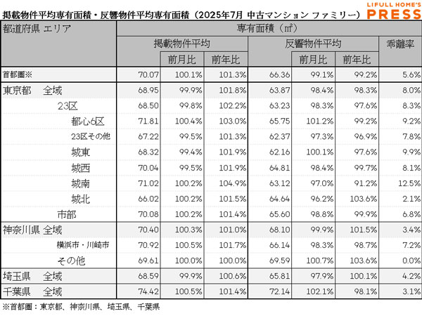 2025年7月の首都圏ファミリー向き中古マンションの掲載物件平均専有面積および反響物件平均専有面積は以下の通り。