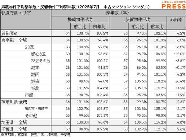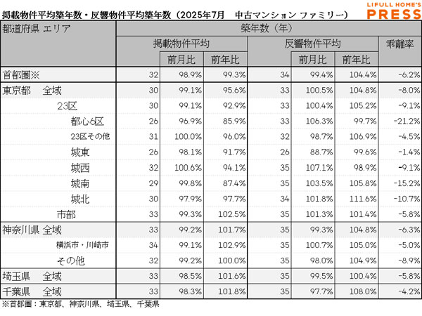 2025年7月の首都圏ファミリー向き中古マンションの掲載物件平均築年数および反響物件平均築年数は以下の通り。