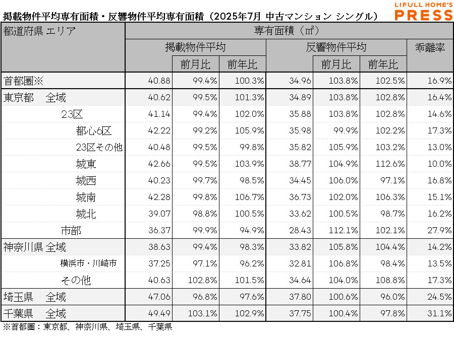 2025年7月の首都圏シングル向き中古マンションの掲載物件平均専有面積および反響物件平均専有面積は以下の通り。