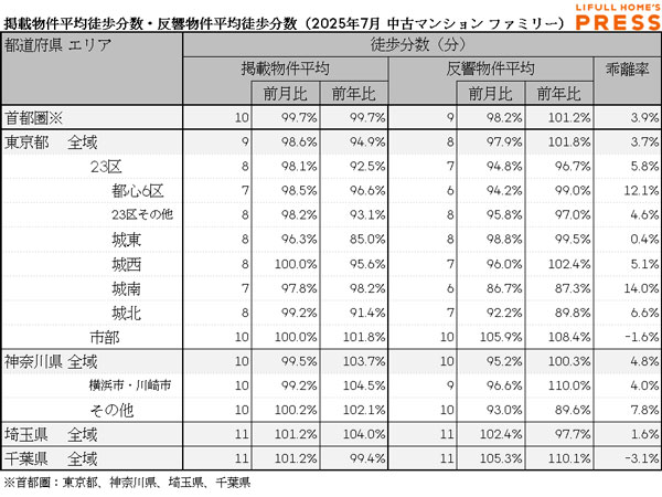 2025年7月の首都圏ファミリー向き中古マンションの掲載物件平均徒歩分数および反響物件平均徒歩分数は以下の通り。