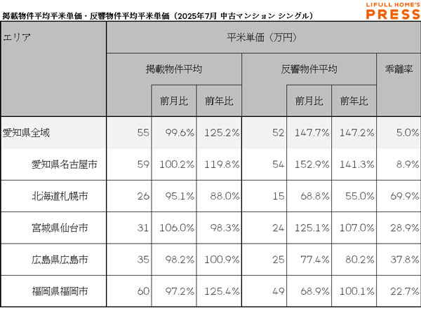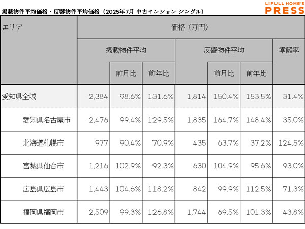 2025年7月の愛知県および地方4市(札幌市、仙台市、広島市、福岡市)のシングル向き中古マンションの掲載物件平均価格および反響物件平均価格は以下の通り。