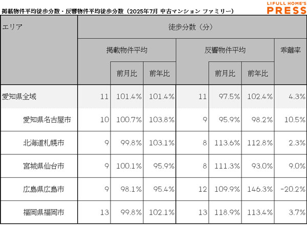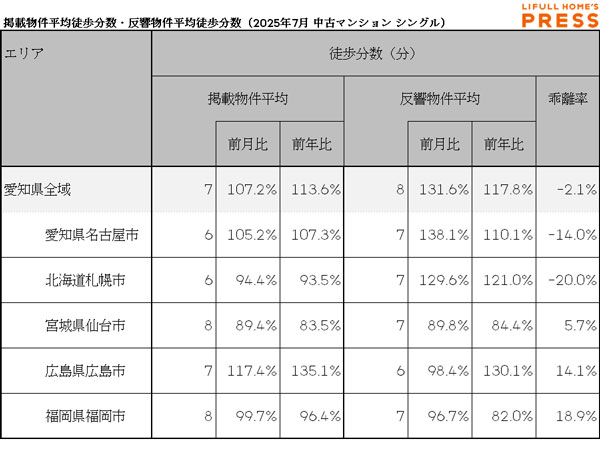 2025年7月の愛知県および地方4市(札幌市、仙台市、広島市、福岡市)のファミリー向き中古マンションの掲載物件平均徒歩分数および反響物件平均徒歩分数は以下の通り。